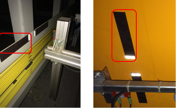 (要点3:由于堆垛机停止位置会有误差,在学习x轴的时候,滑触线上的第一个反光条反光部分需要加长,如下图)