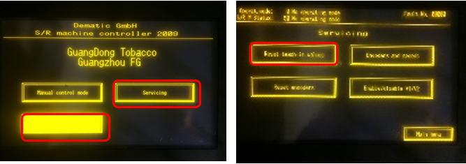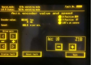 5)手操器上点亮“Master touch-panel”后,点击“servicing”,再点击“Encoders and speeds”进入z轴货叉控制界面