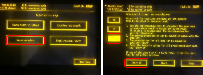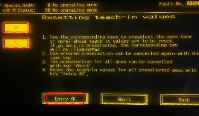 手操器上点亮“Master touch-panel”后,点击“servicing”,再点击“Reset teach-in values”进入重置界面